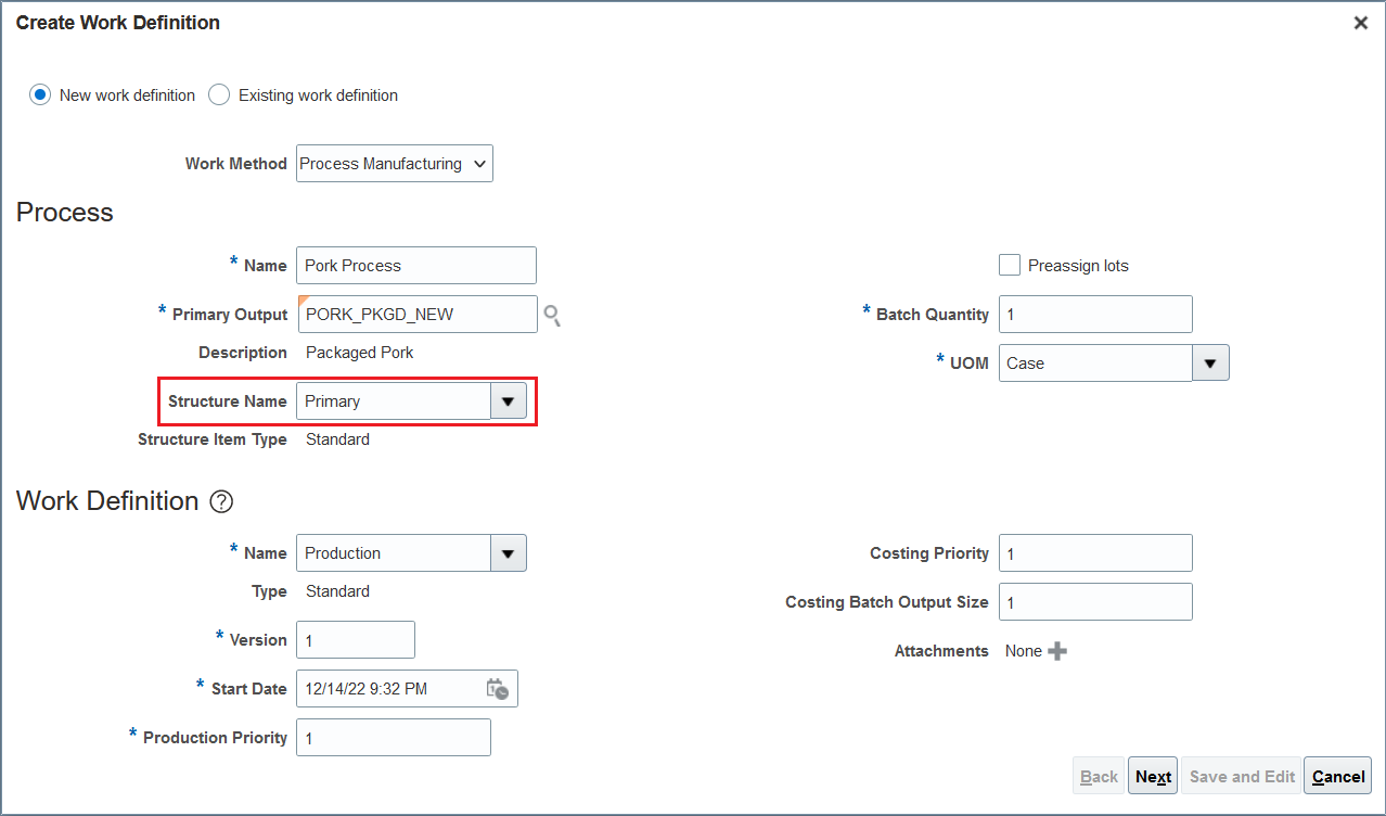 - With this update, there won't be an ability to associate an item structure with an existing process manufacturing work definition. You'll have to create a new process manufacturing work definition to be able to associate an item structure.