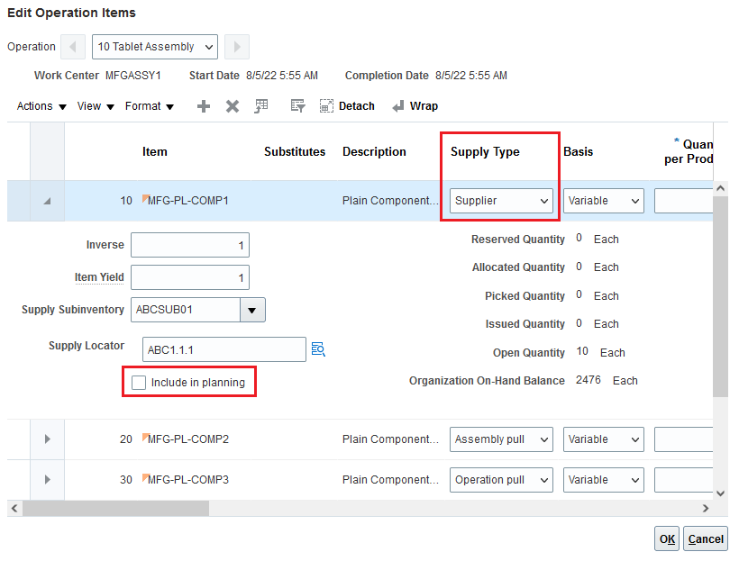 The Include in planning indicator is unchecked for the operation item with supply type as Supplier, based on the plant parameter.