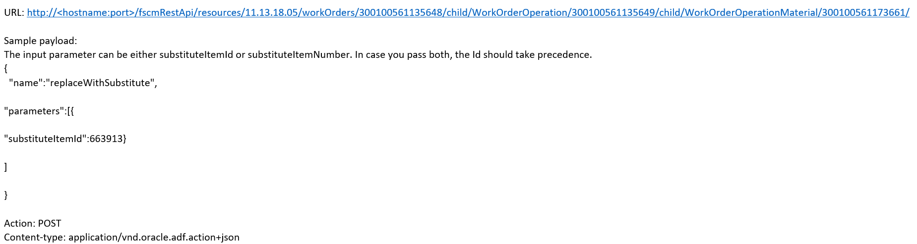 You now can view and replace substitute components for discrete and process work orders using the Replace with a substitute action on the Work Order Materials REST service, which is a child of the Discrete Work Orders REST service.