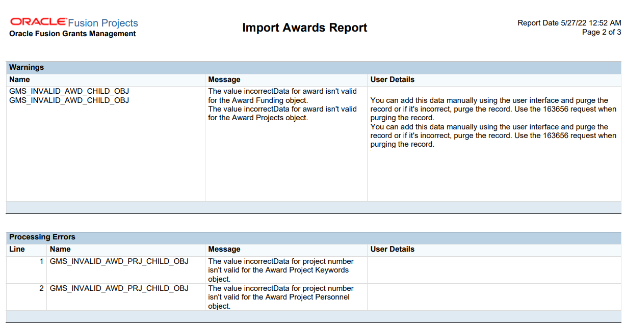 The business benefit of providing complete error or warning information when importing awards and related data is that there is no loss of data, especially when importing awards from other systems or when loading historical awards. Grants administrators can make informed decision to correct and re-import or ignore the award, thus managing award data efficiently.