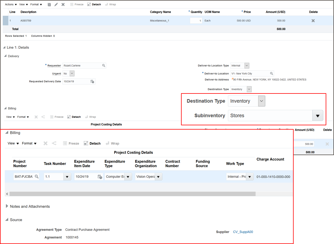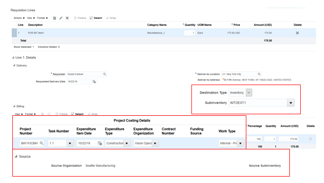 - Create and approve requisitions to purchase material to an inventory destination for a project