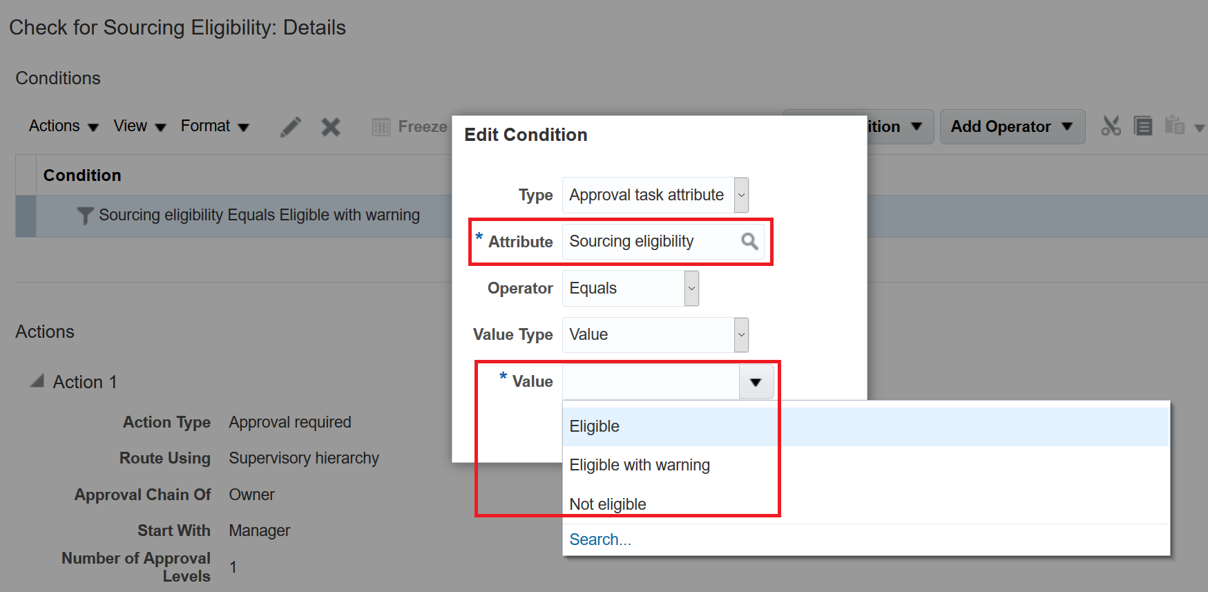 - For approval routing based on the Bank Account Level rule condition attribute, you have the option to select one of the three values: Supplier Header, Supplier Address, Supplier Site. This rule condition attribute allows you to configure rules that can be conditionally triggered depending on the level at which a bank account is defined or changed.