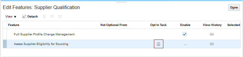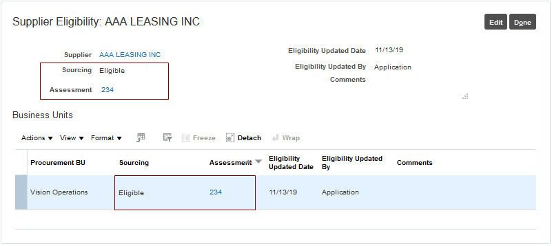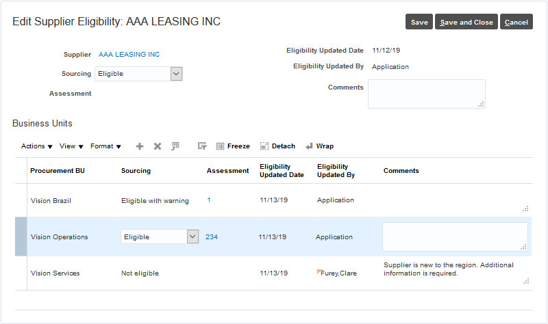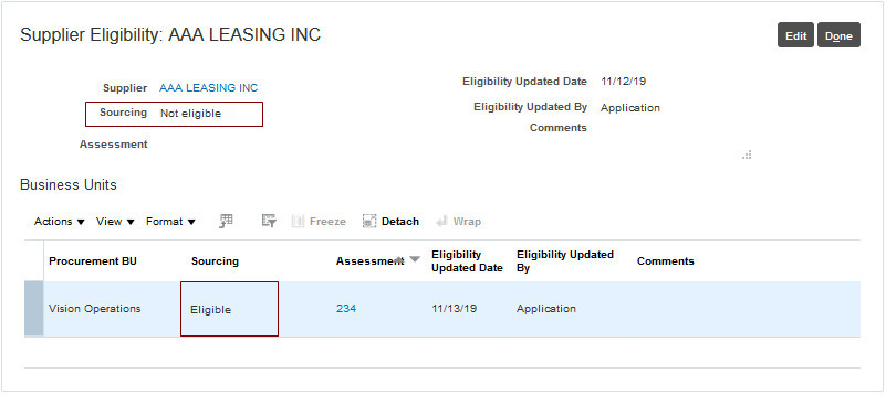 Opting in to the Assess Supplier Eligibility for Sourcing feature enables you to assess your suppliers’ sourcing eligibility. When you’re ready to consider the suppliers’ sourcing eligibility in your sourcing negotiations you should enable the Enforce Sourcing Eligibility for Suppliers in Negotiation feature in Sourcing, which can be selectively set for a Procurement BU.