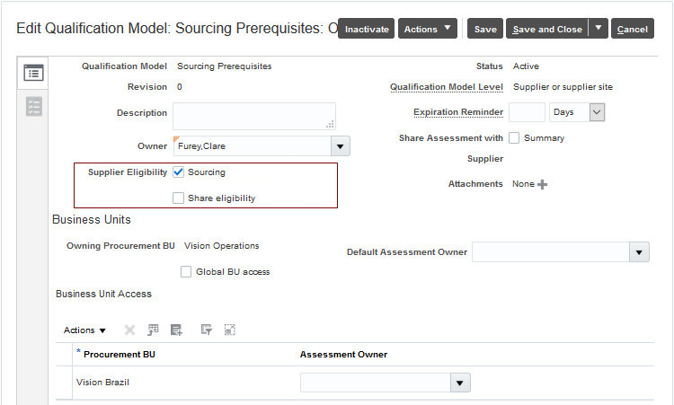 Automatically assign an owner to your supplier qualifications and assessments based on the business unit managing the evaluation. You can now easily manage the default owners on the area and model for automatic assignment on transactions. Using this default helps you ensure the appropriate individual accepts and evaluates each supplier qualification or assessment.