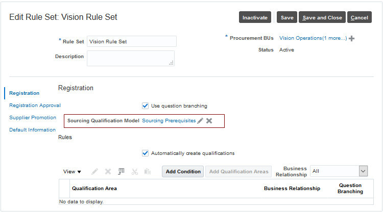 Specify the sourcing qualification model for supplier registration, supplier registration approval, or both.