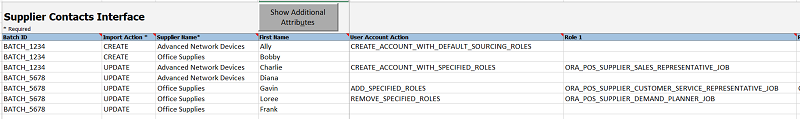 In the supplier contact import template, the User Account Action column allows you to create or update a user account for specified contacts. When creating a user account, you can choose to assign the default roles associated with the Supplier Portal work area or the Sourcing work area. Alternatively, you can specify individual roles to be assigned to the user account. The update user account action allows you to add or remove specific roles, or inactivate the user account. You can use the Role 1 to Role 10 columns to specify specific roles based on the user account action.