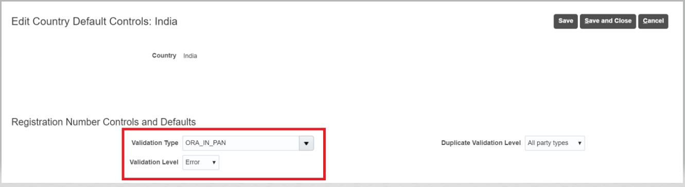 - Configure the tax registration number in Setup and Maintenance work area, go to the Manage Country Default Controls task: Offering Procurement - Functional Area: Transaction Tax. If you are already validating tax registration number in the application, you don't need to change the country default controls.