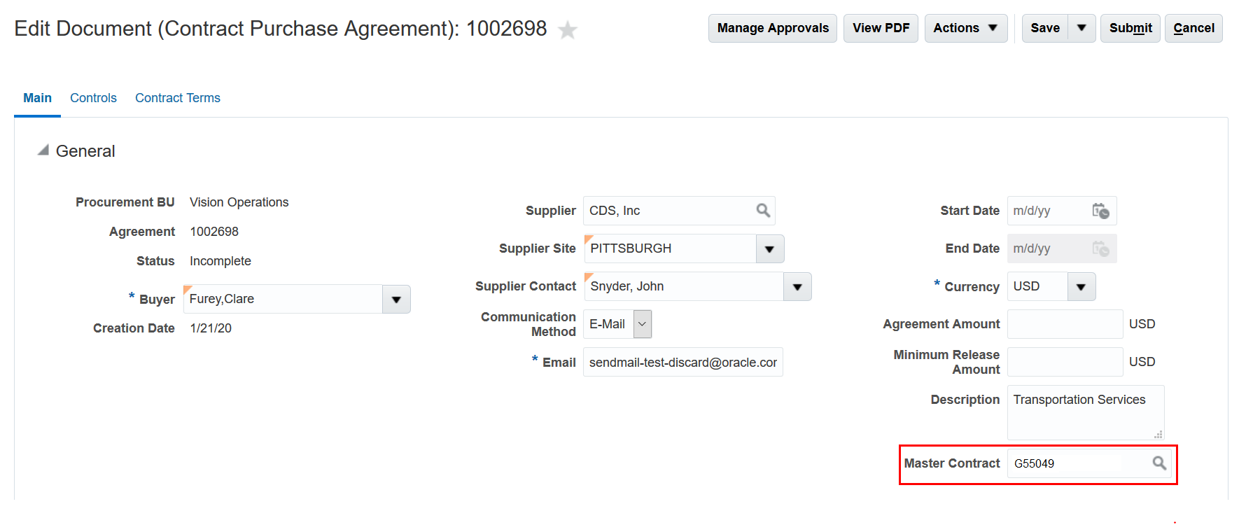 - You can associate new purchase agreements with master contracts when you author new purchase agreements online. In update 20B, you can make the association between purchase agreements and master contracts only. You can't associate purchase orders with master contracts until update 20C.