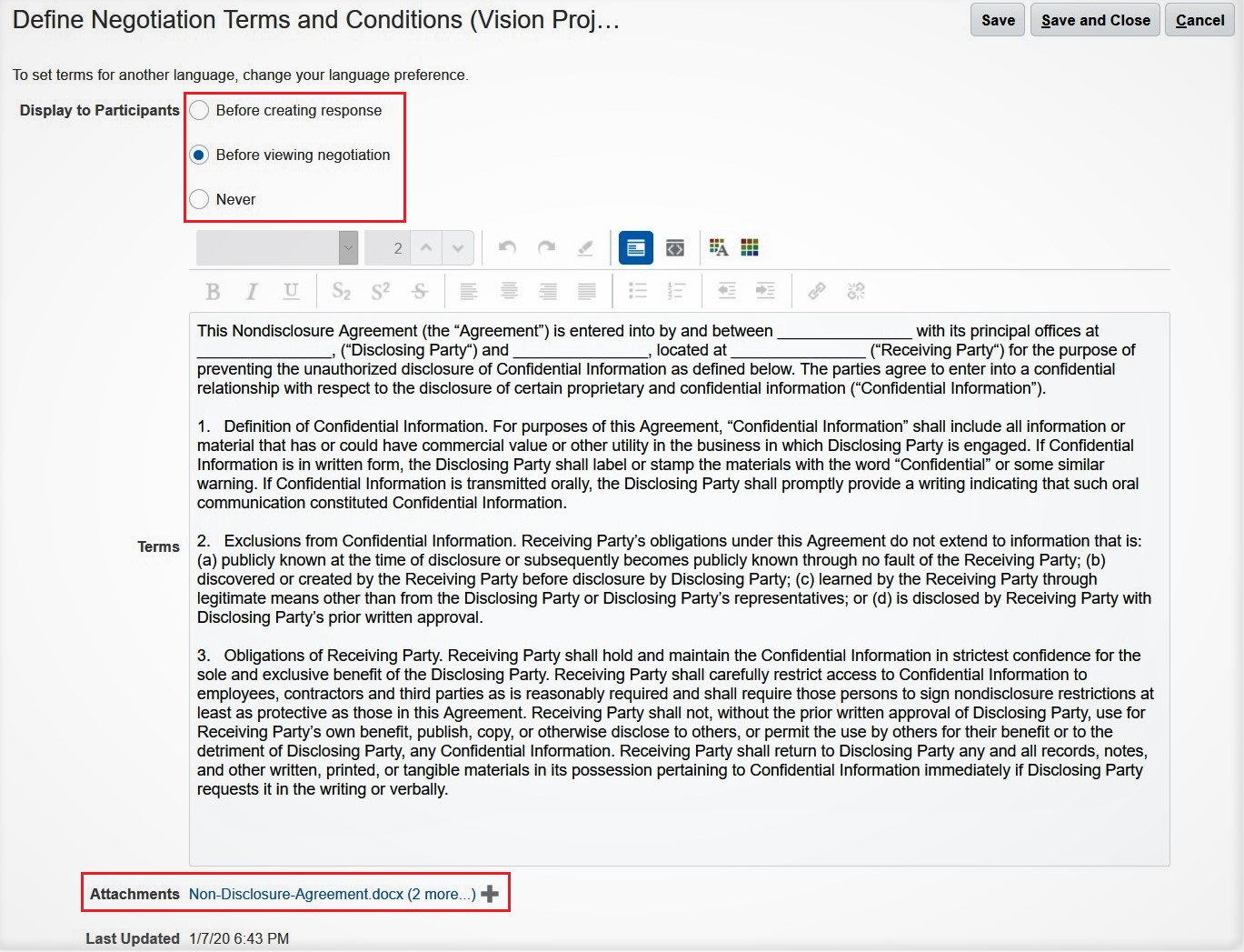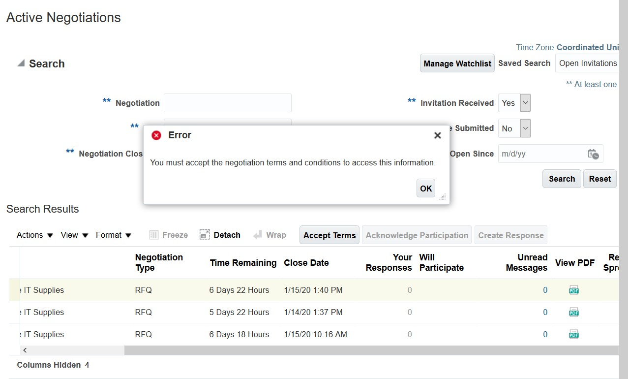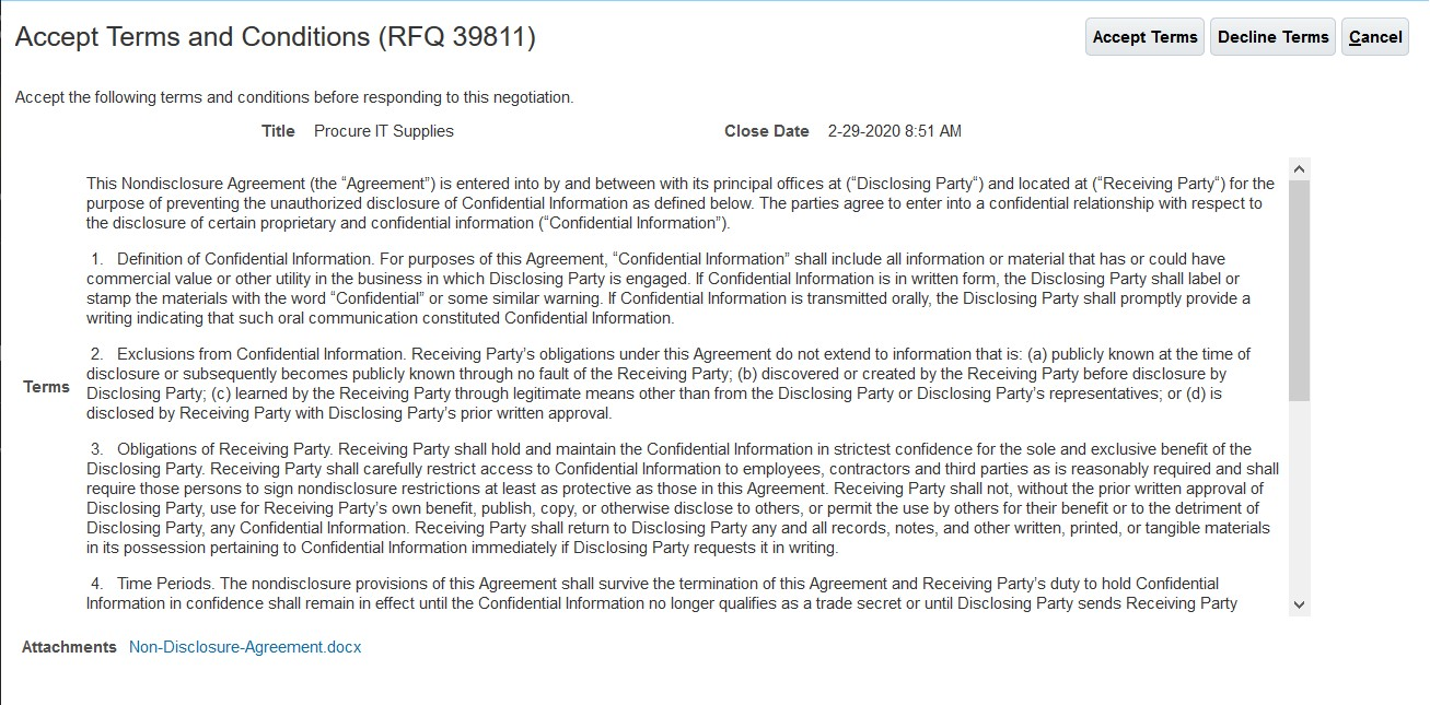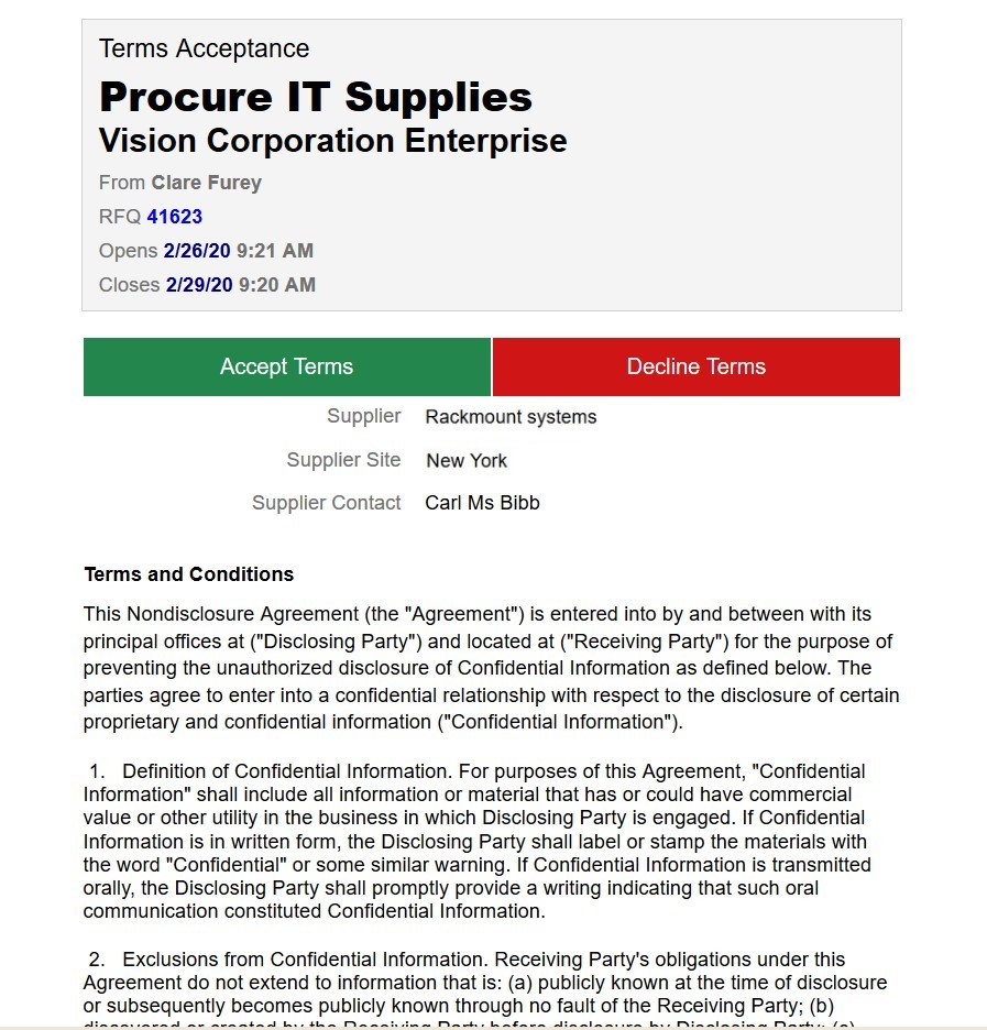 - When supplier contacts search and attempt to access a negotiation online from supplier portal, they are first presented with these terms and conditions. Only after they accept, they can access the negotiation details, or create a response.
