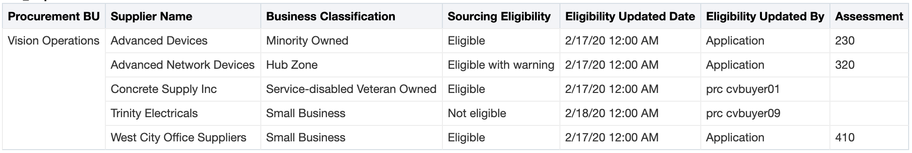 Sample Report Showing Suppliers' Sourcing Eligibility in a Procurement Business Unit