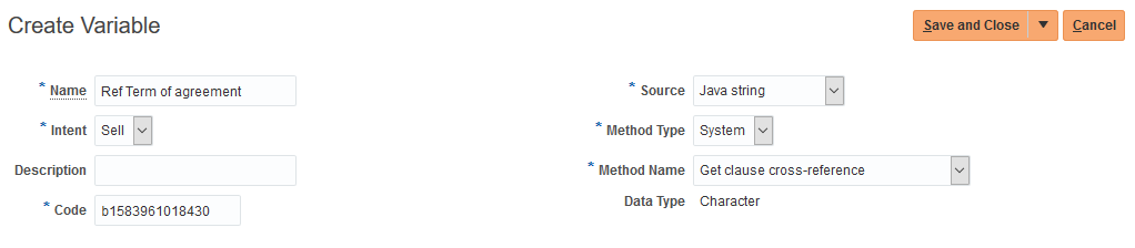 - Create variables for any Terms Library clauses that you want to reference. Variables that you want to use in cross-references must be defined with a source of Java string, and the system method name Get clause cross-reference.
