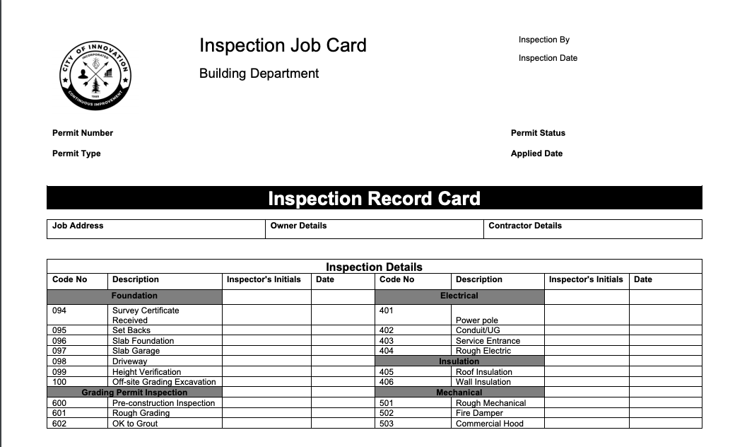The inspection job card tracks ongoing inspections for a specific permit. The Job Card report is a BI Publisher report that can be copied and further configured for your agency's needs. The Inspection Job Card report is available through the BI Catalog.
