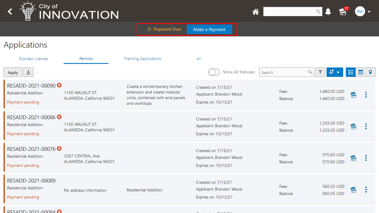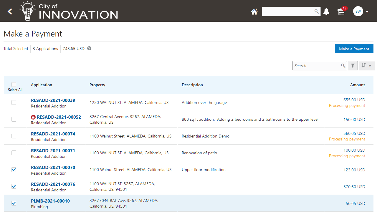 Registered public users who are applicants can now see the total fees due and the number of applications with fees in a banner on their landing page. The Make a Payment button in the banner provides access to the Make a Payment page, where applicants can select multiple applications for payment. The applicant can also access the Make a Payment page through the fees banner on their Applications list page as well as the payment icon in the global header.