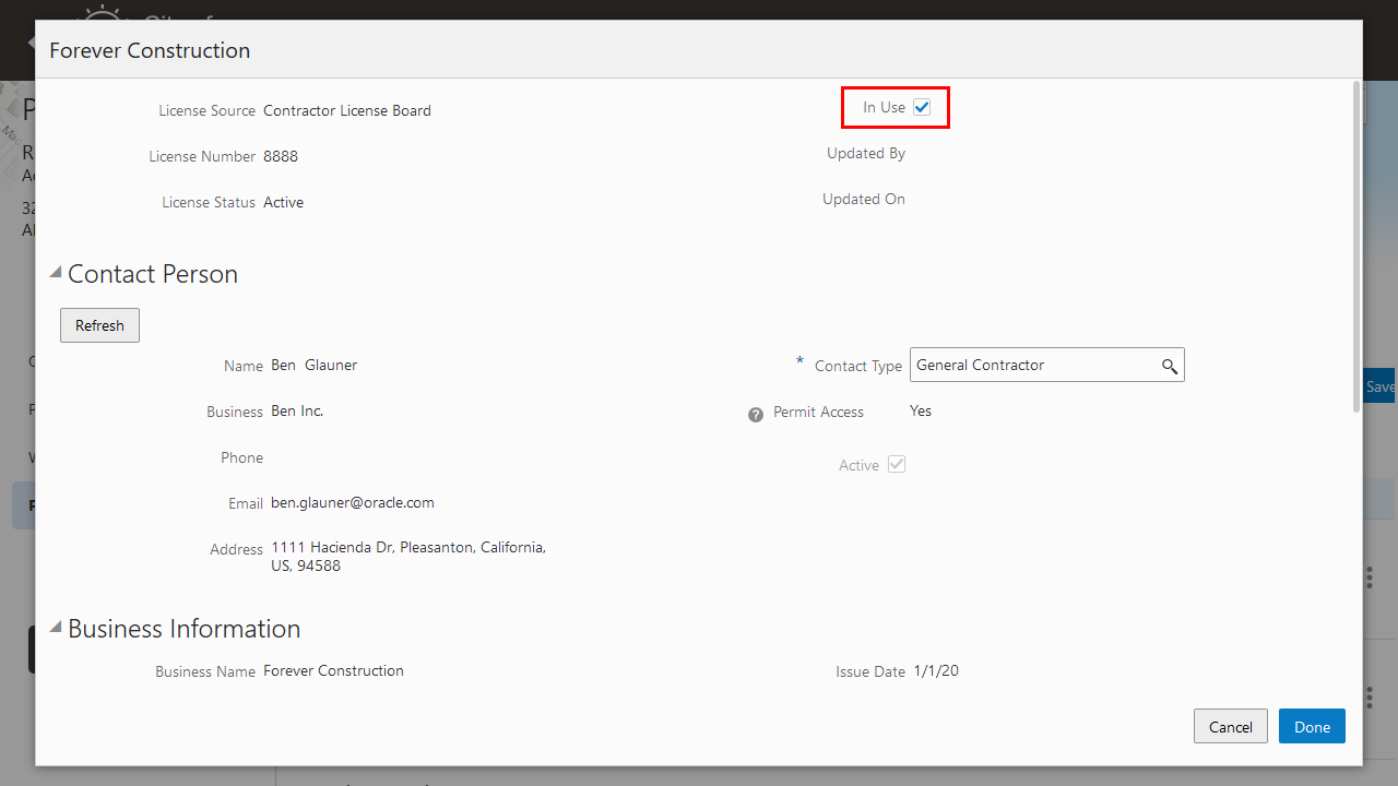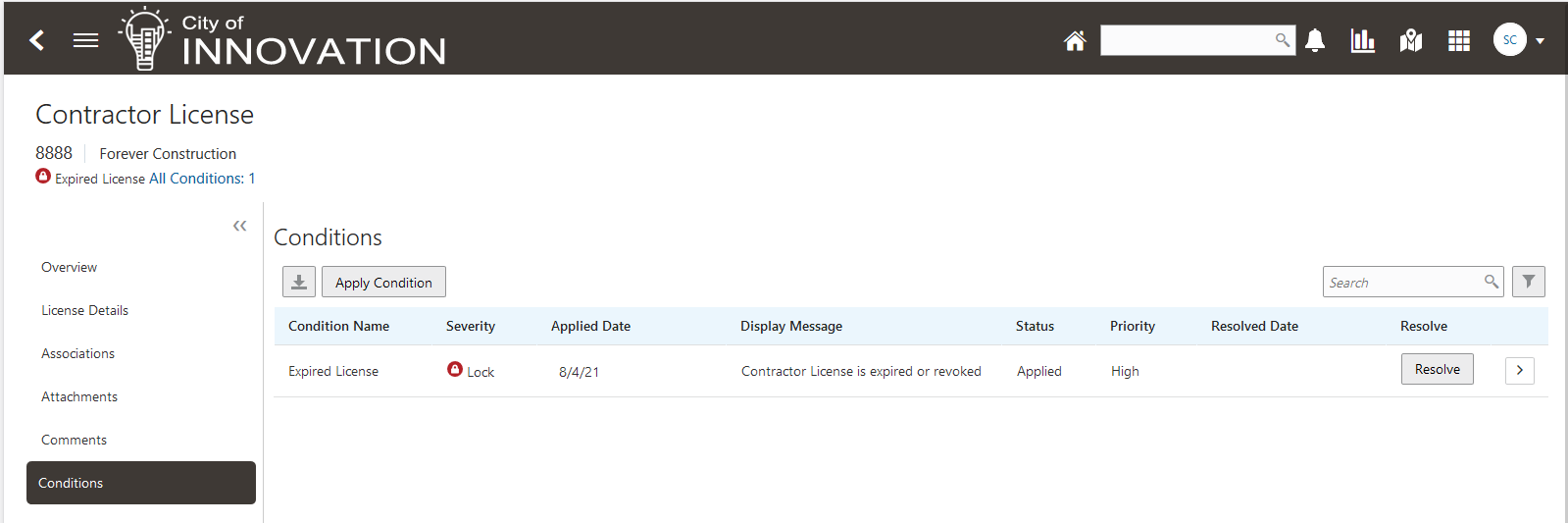 - See Using Community Development Permits, "Managing Contractor Information," Applying Conditions to Contractor Licenses on the Oracle Help Center.