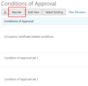 This feature allows agency planner to re-order the conditions of approval once they are entered into the system. Entitlements and other decision documents include conditions of approval that clearly describe to the applicant, decision-makers, agency staff and the public the action that is required to occur and how that action will be accomplished.
