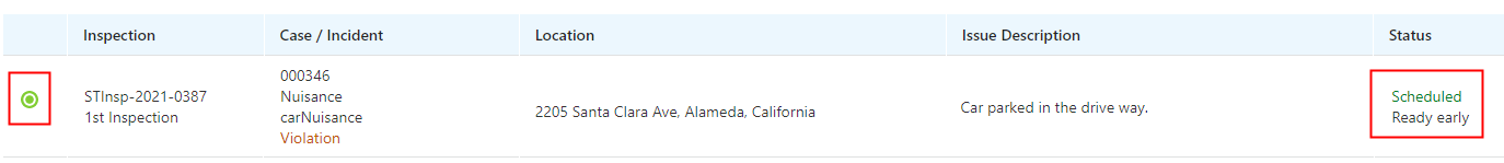 The case will be displayed as "Ready for Inspection" in the Municipal Code Officer mobile application as well as in the Code Officer Worklist page.