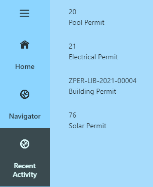 Use the Recent Activity menu to navigate quickly between transactions you are working on. As you access the transactions, such as permits, planning applications, parcels, and so on, the items get stored in Recent Activity menu. Simply select Navigator > Recent Activity to view all of the transactions you have visited recently and jump straight to them to finish your work.