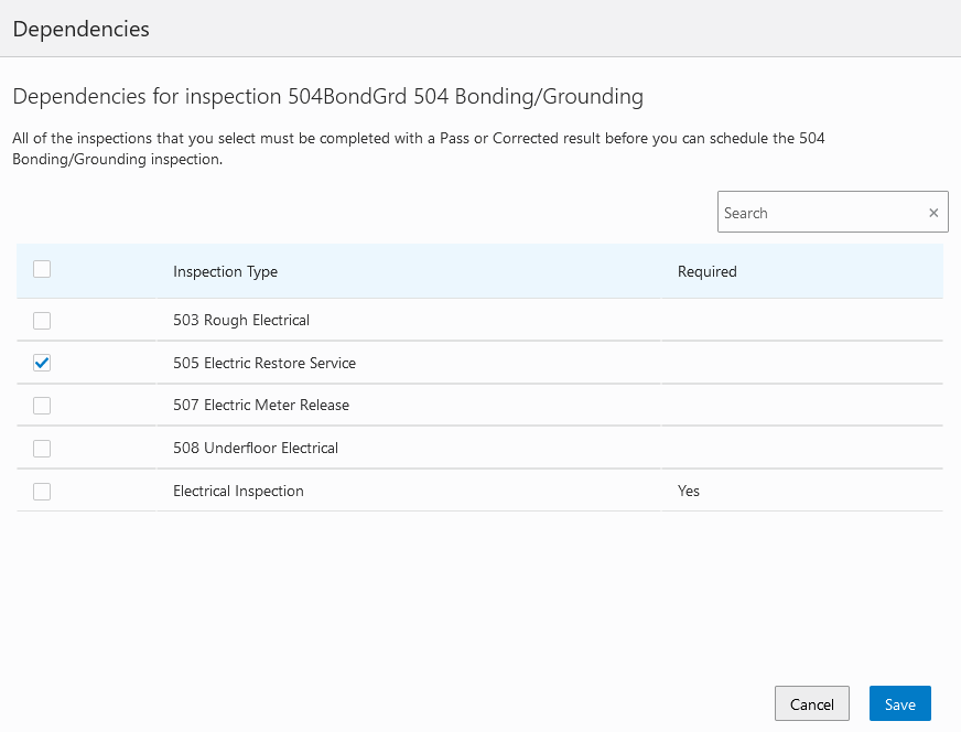 Agencies often require inspections to be completed in a specific order. In addition to identifying the final and required inspections for a permit or planning application, agencies can now define the inspection sequence by setting up inspection dependencies. The agency identifies which inspection types have dependencies in the inspection group. The system ensures that prerequisite inspections are completed with a Pass or Corrected result before the next inspections can be scheduled or assigned. Applicants can't schedule an inspection with a dependency requirement, but agency staff with appropriate permissions can override the rules.