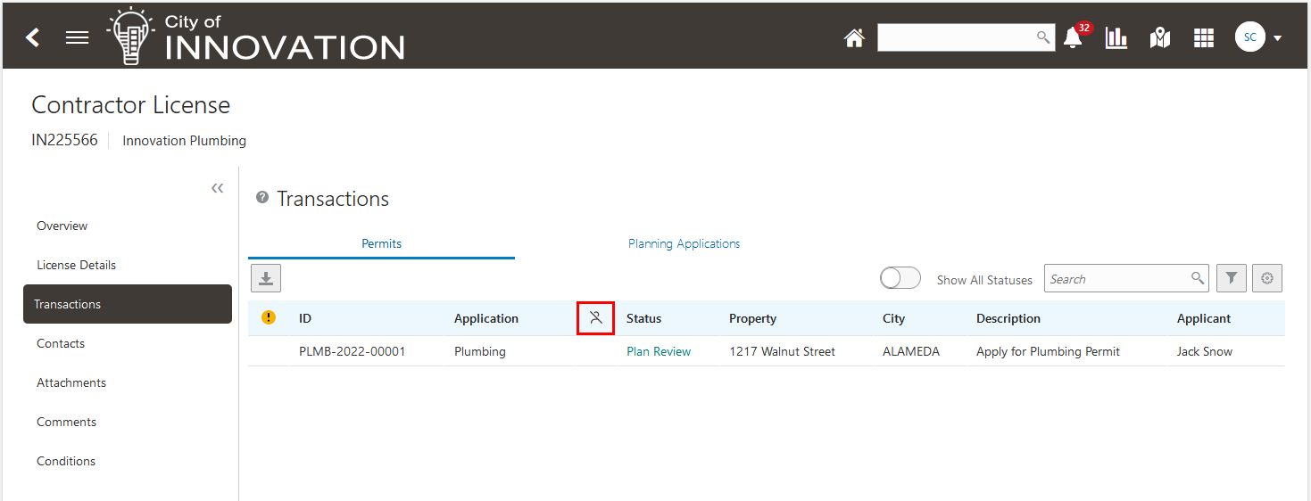 The agency's license records offer a quick view of all transactions associated with a contractor license in the license details. The contractor details list the active permit and planning applications where the contractor is used. A filter provides the option to display applications that are no longer in progress, and an icon identifies applications where the contractor is no longer in use. Clicking the transaction in the list takes the agency user to the transaction details.