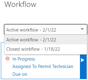 After reopening a permit or a planning application, a new workflow process instance gets assigned to the reopened transaction. From the Workflow tab for that transaction, you can view the active workflow instance as well as any previously closed workflow instances. Use the workflow drop-down list to select an active or closed workflow, which are listed chronologically.