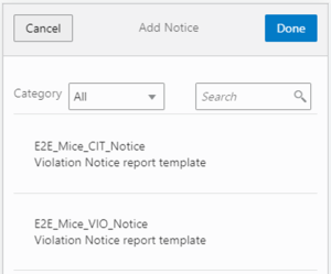 To add a new ad hoc notice, click the Add Notice button and select from a category or search and select a notice, as shown in the example: