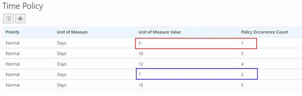 Example of the Time Rules page with policy occurrence and Unit of Measure values set up for compliance: