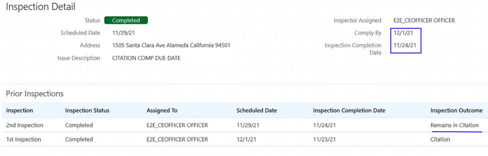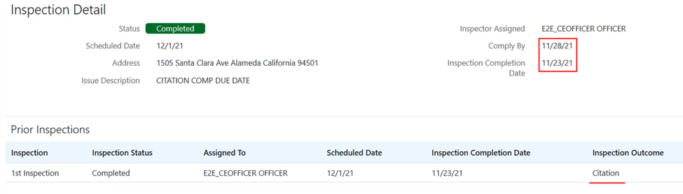 Inspection Detail Page Showing Compliance Date and Inspection Completion Date As Set Up in Time Rules