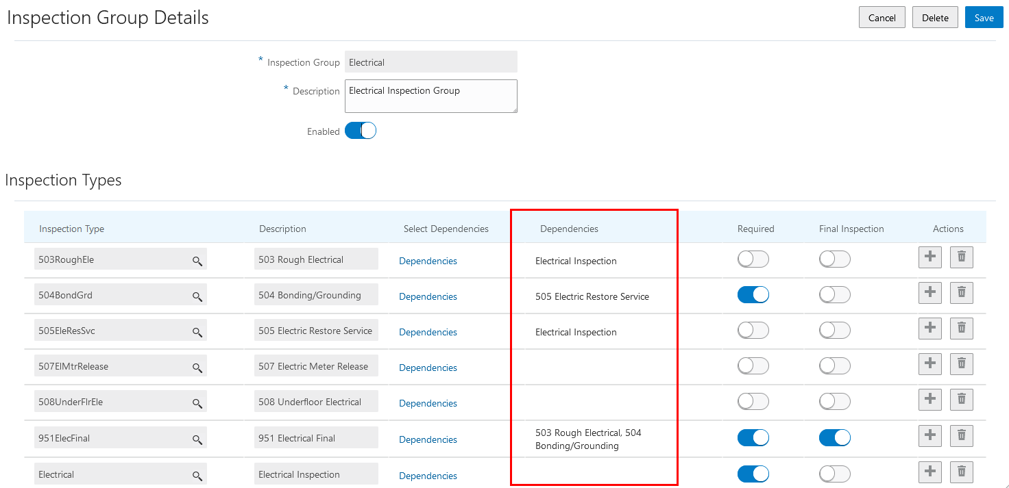 Example of the inspection dependencies defined for inspection types in the inspection group: