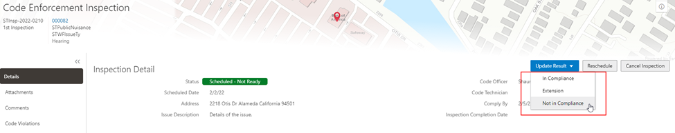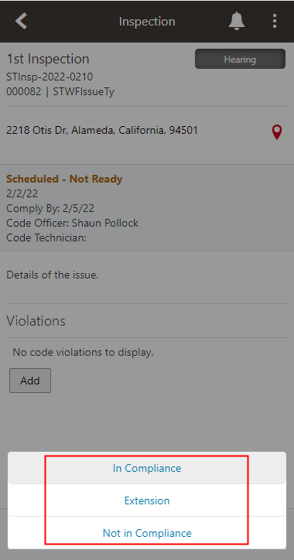 Code officers can submit inspection results based on whether the case is in compliance, needs extension, or not in compliance.