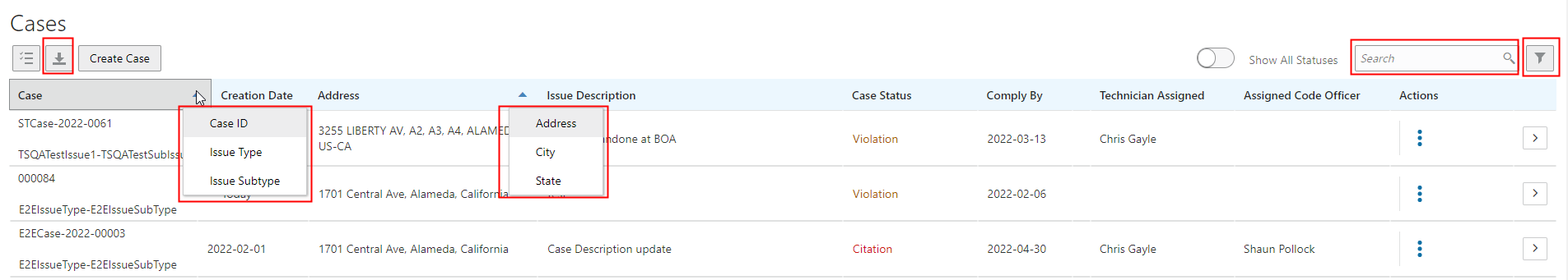 This example illustrates the download, search, filter, and case and address sorting attributes on the Cases console for agency staff: