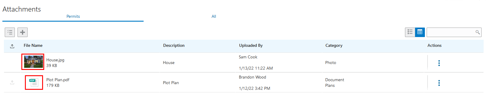 Example of a thumbnail image and PDF preview icon on the Attachments page in the permit details: