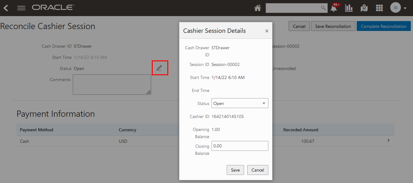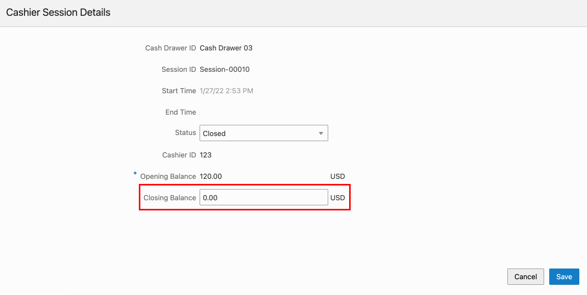 They can also close a cashier session from the Reconcile Cashier Session page. Click Edit to access the Cashier Session Details modal window. Enter the closing balance with the amount in the cash drawer, update the status to Closed and save the Cashier Session.