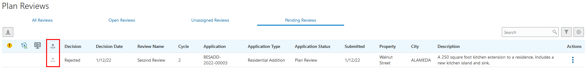 Example of the Pending Reviews page in the Plan Review Console showing the Uploaded Documents icon: