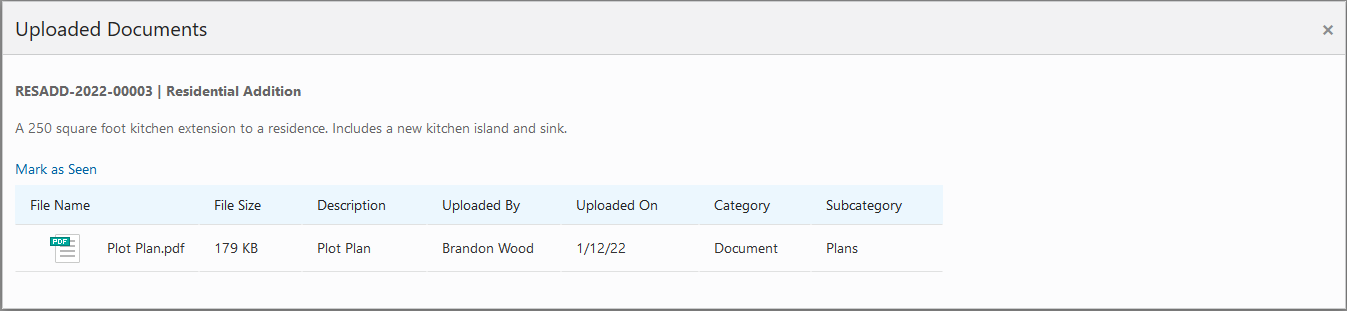 Plan coordinators can see at a glance when an applicant has uploaded a document for a plan review cycle. When an applicant uploads a PDF document, the Uploaded Documents icon appears in the Plan Review Console next to the permit or planning application row where the document was attached. Clicking the icon opens the Uploaded Documents page, where you can preview the file and review file information.