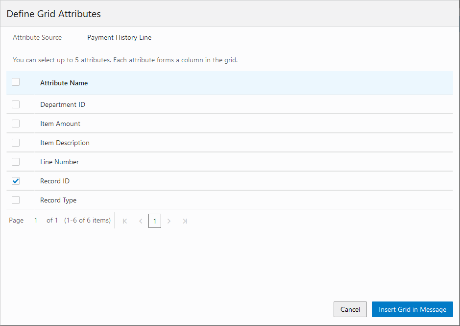 When you set up the communication template for the communication event BNP-PAYMENT-RECEIPT, in the Communication Template Details page, you can click Add Grid and select up to five payment history line attributes: Department ID, Item Amount, Item Description, Line Number, Record ID, or Record Type.