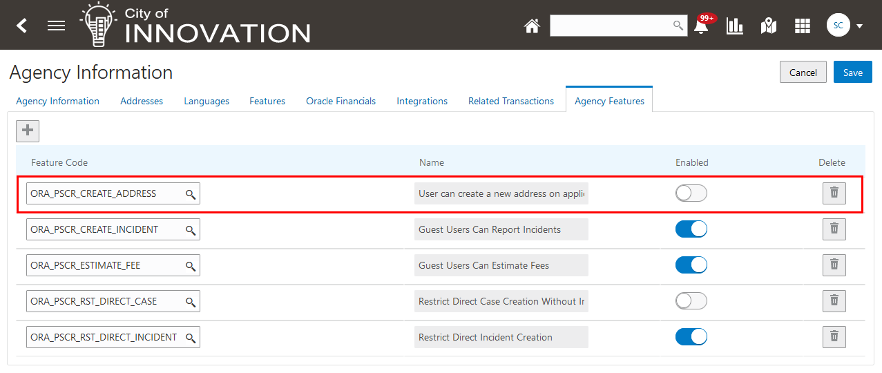 Agency staff can disable the Feature Code ORA_PSCR_CREATE_ADDRESS on the Agency Information page. After disabling the feature code, during application intake, the "Create New" link will no longer appear.