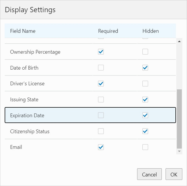 - In the Business Owners predefined field group, choose the display setting for Citizenship as either "Required" or "Hidden".