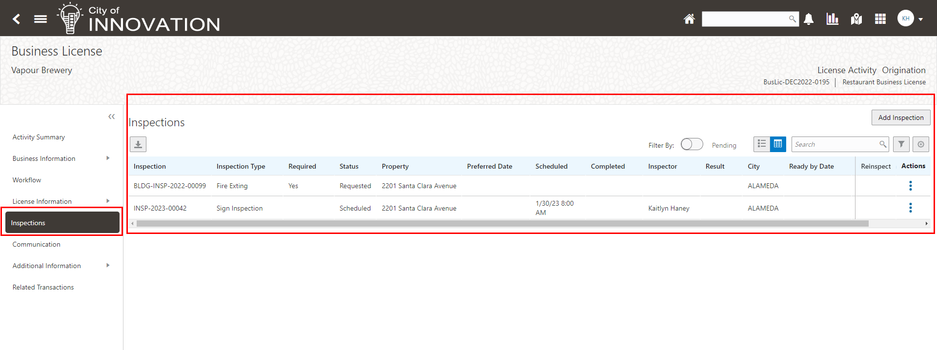 - Inspections - This tab displays documents that were uploaded in the Oracle Inspector mobile application for an inspection associated with the business license transaction.
