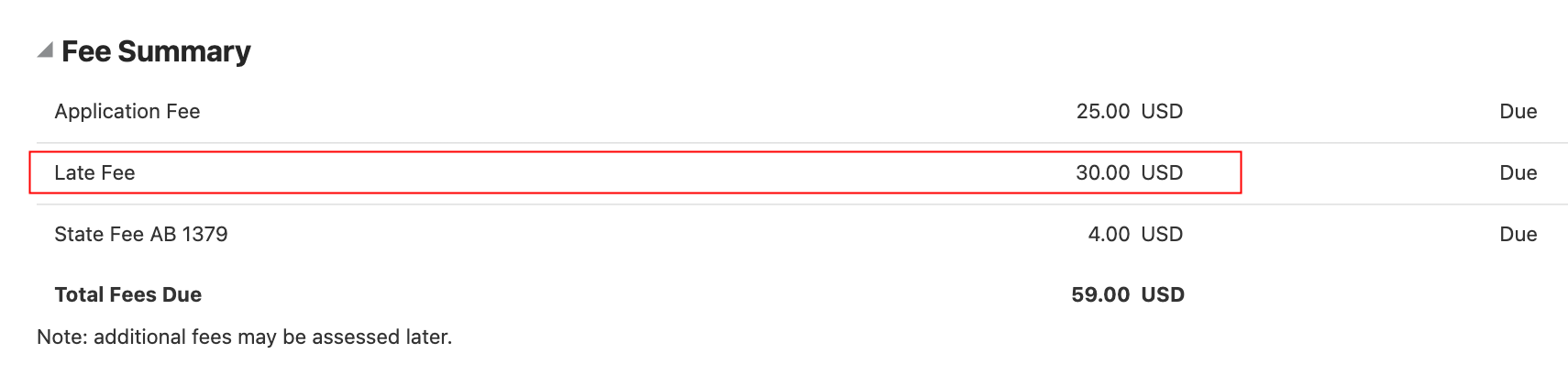 When business users are filling the application for a renewal of their business license, the system automatically adds fee components calculated based on the number of days past expiration date and your agency’s fee schedule settings.