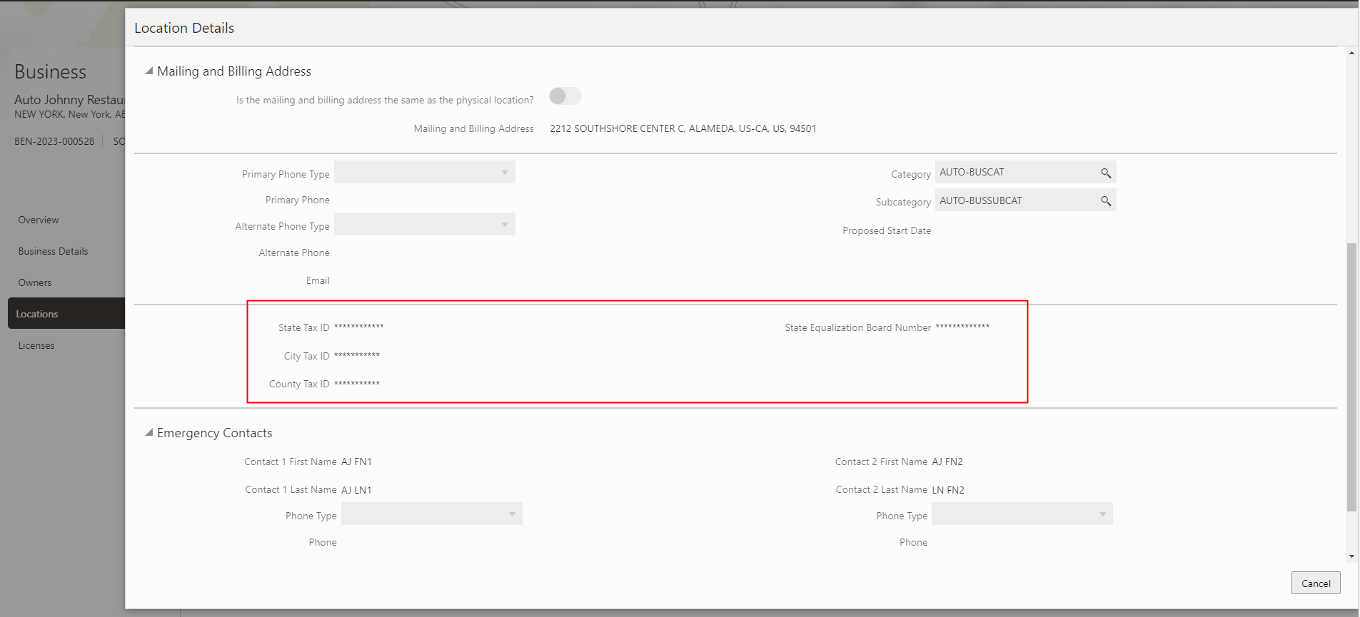 Agency administrators can now decide which information they want to show or hide from various types of users. By assigning users to roles that have predefined access to confidential business information, users can view values in the fields such as the federal, state, and city tax ID.