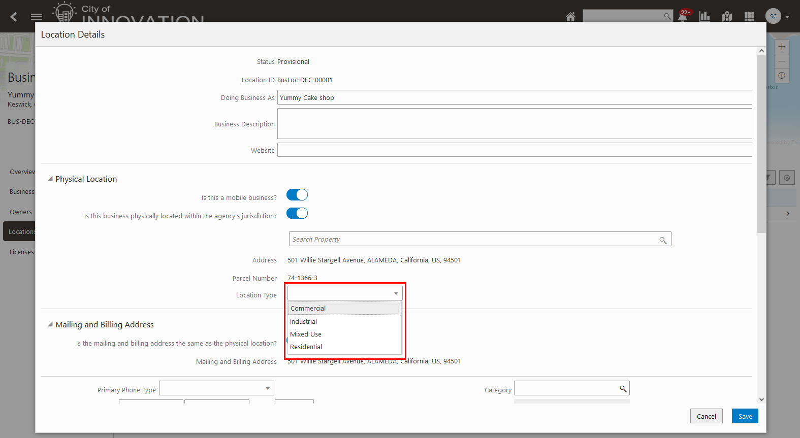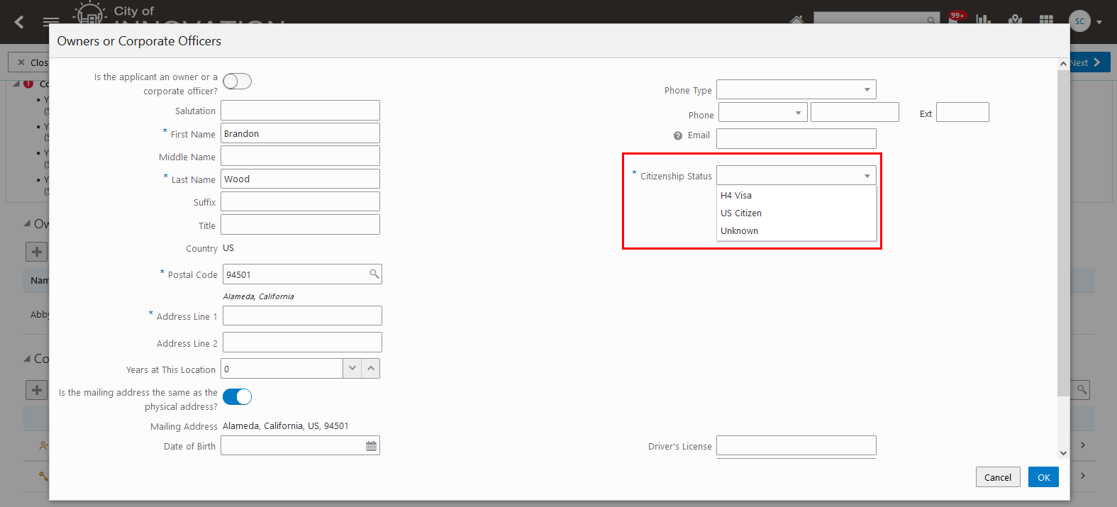 Attribute display is controllable in Business License Designer. On the Location Type page, the Business Location attribute was added. Additionally, on the Business Owner page, the Citizenship Status field was added.