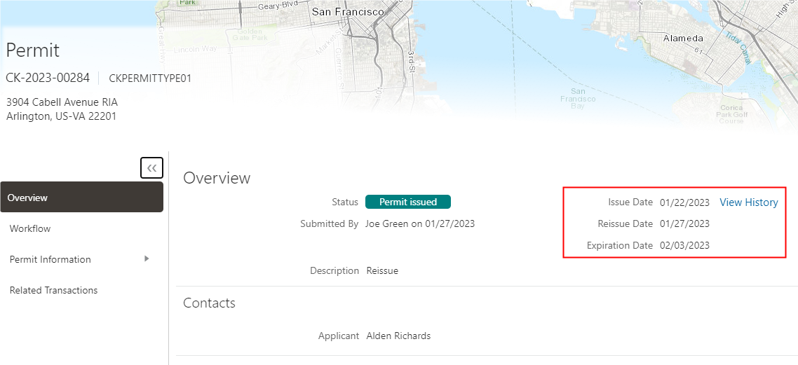 This example illustrates the most recent issue date, reissue date, and the link to the permit’s issuance dates history page: