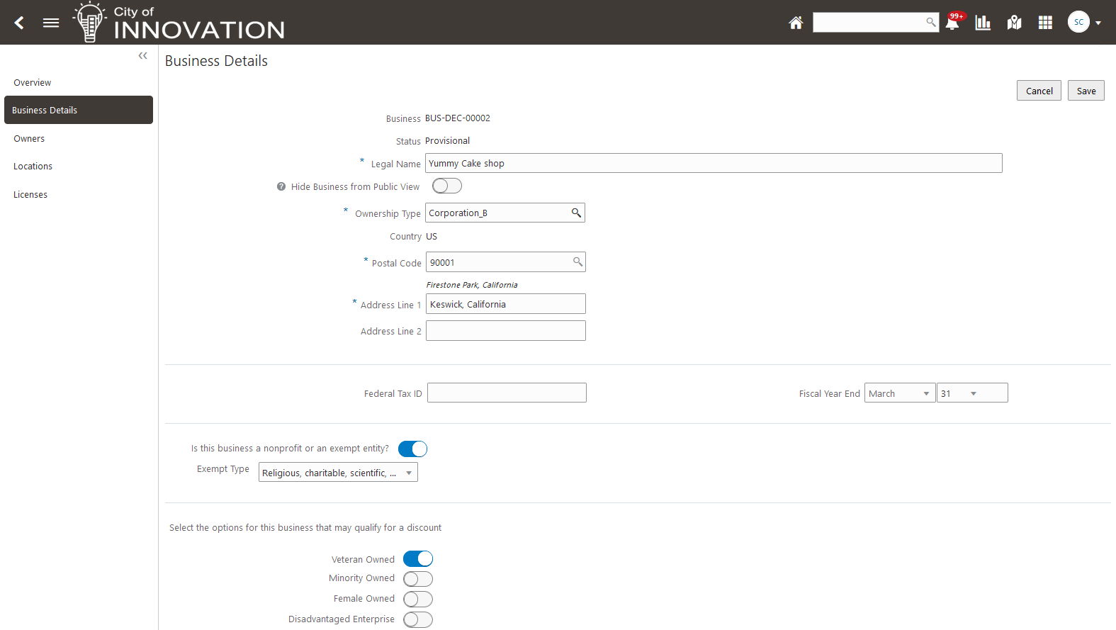 Any updates you make on this page will be automatically synced to the current business licenses as well as in-progress activities for this business.