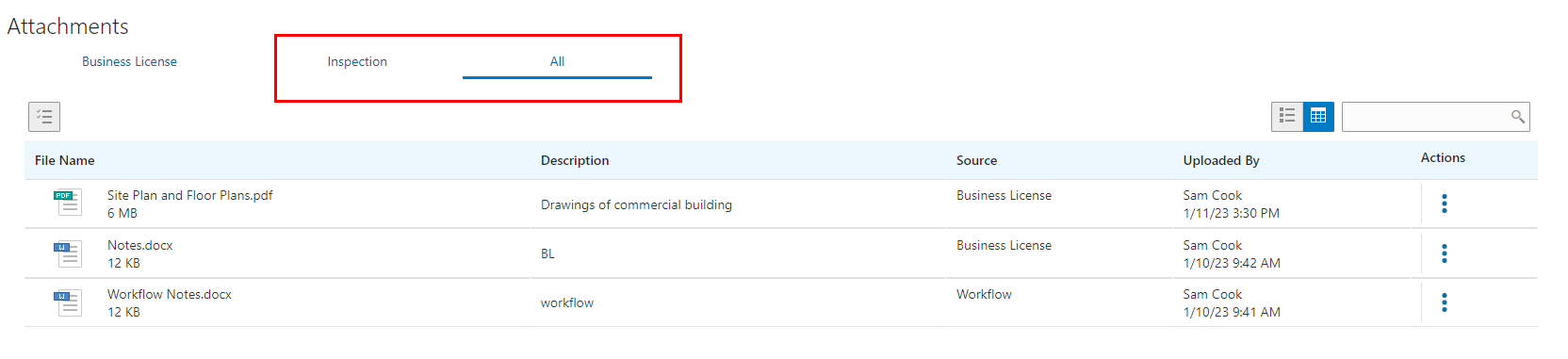 New tabs appear on the Attachments page in the business license transaction details: Business License, Inspections, and All. Whereas you could previously see only documents uploaded directly to the business license attachments, now you can also see: