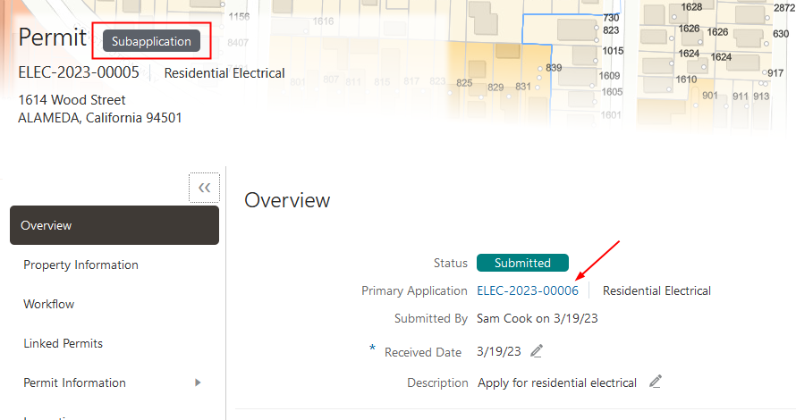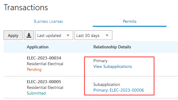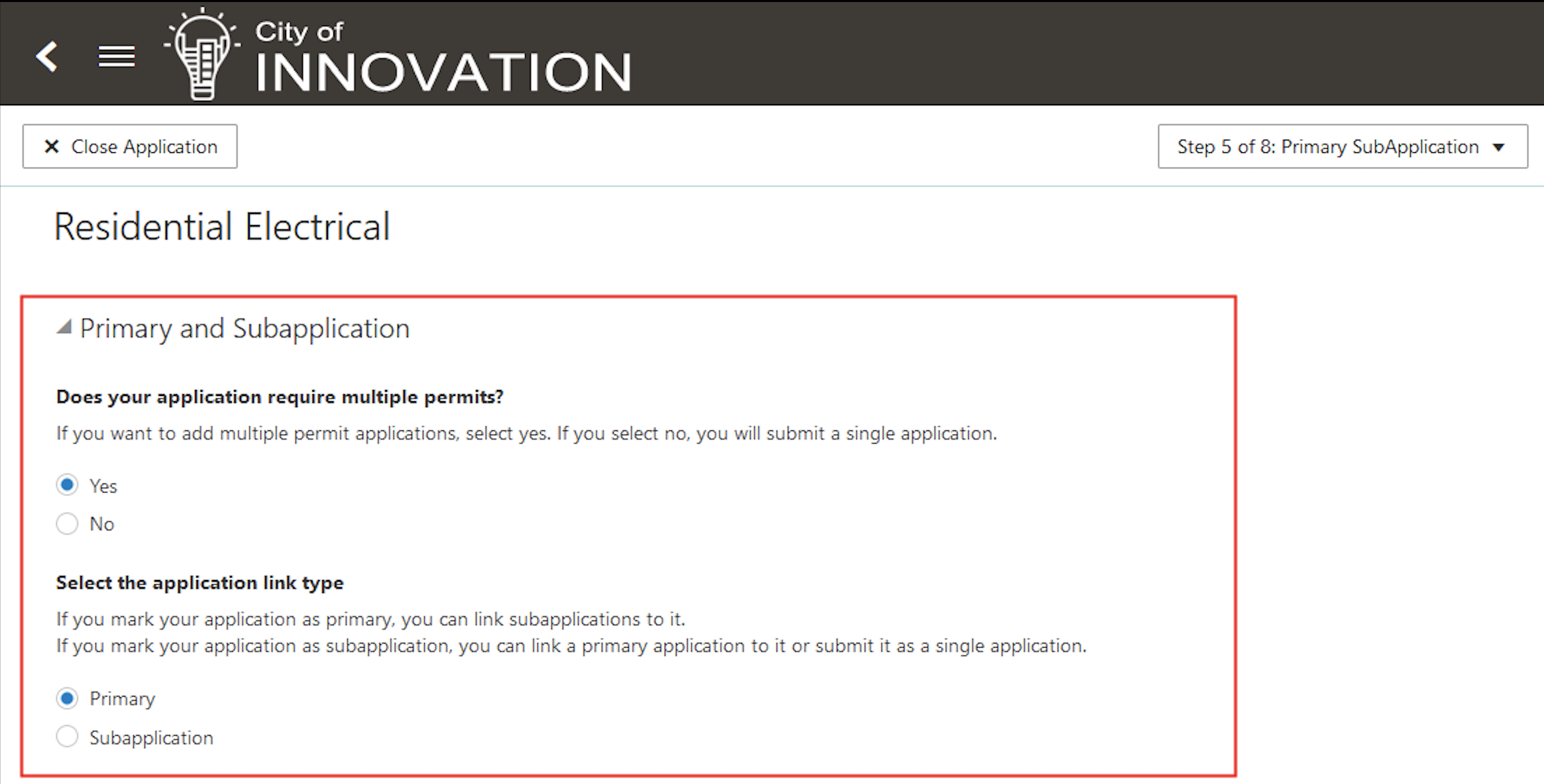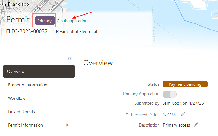 - Mark the permit intake form as primary and submit the application. Later when needed, access the submitted application, add or create one or more subapplications to the primary permit application.