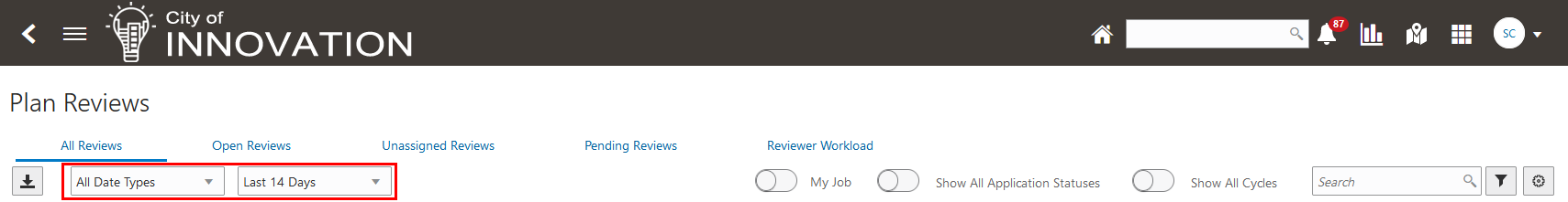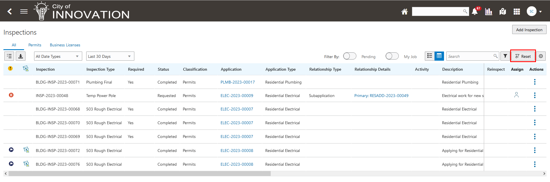 The Inspections console page for agency staff now retains your search, filter, and sort results when you navigate away from the All, Permits, or Business License tabs. Your selections for the Date Type and Date Range fields as well as the Pending and My Job switches are maintained while you work until you intentionally clear them or log out, ending your session.
