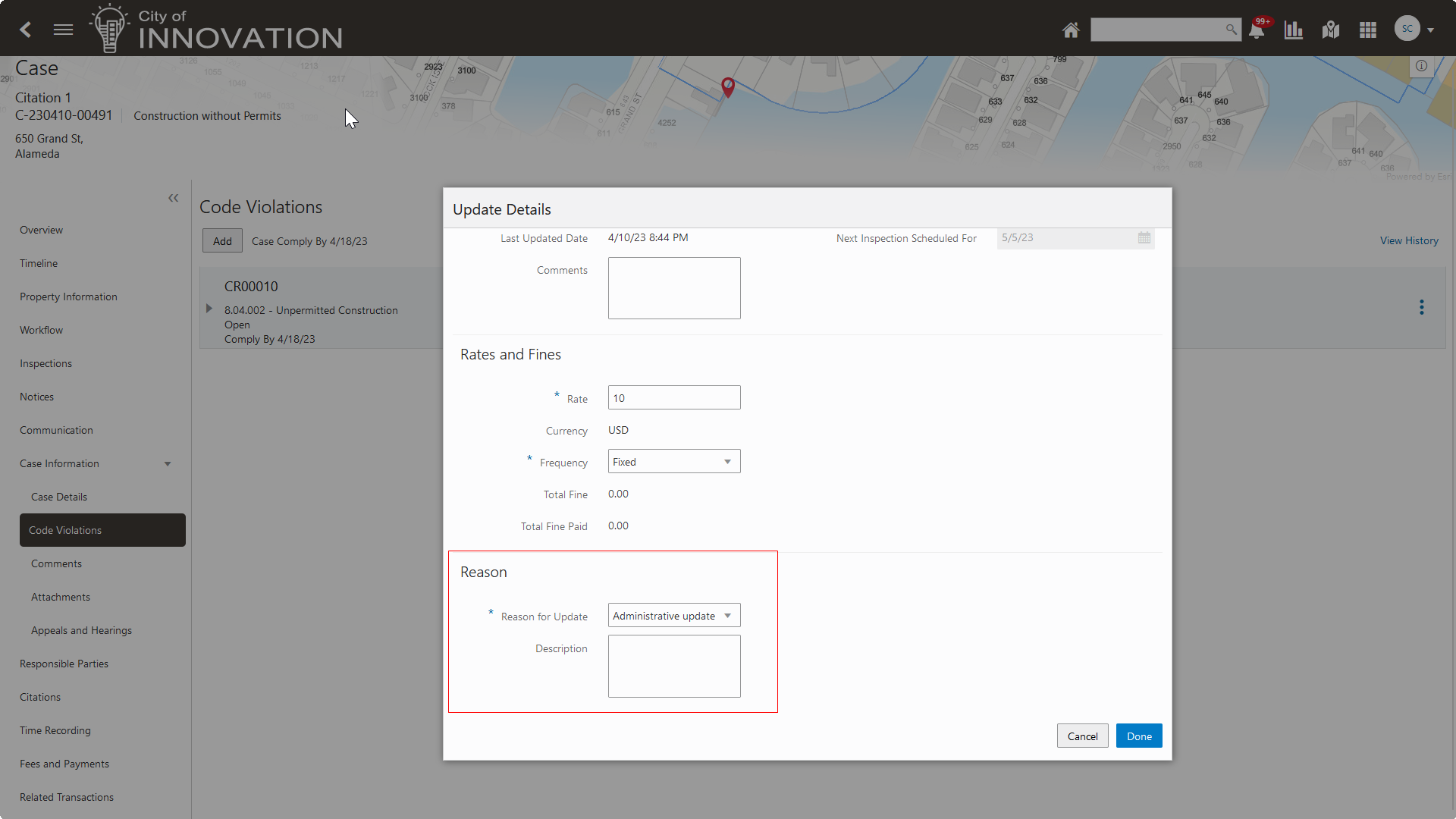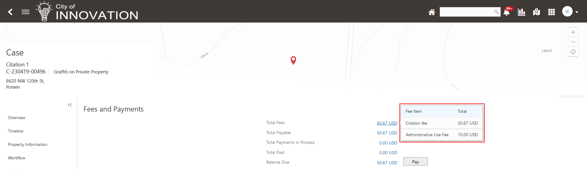 - See Using Community Development Code Enforcement, "Working with Code Enforcement Fees and Payments" on the Oracle Help Center.
