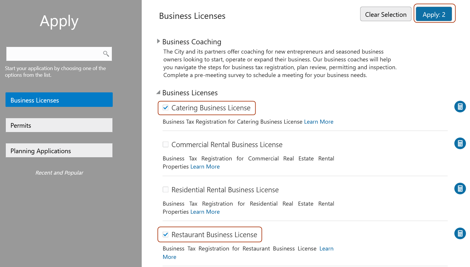 Multiple permit applications required for a project can all be added to one intake form. Applicants and agency staff can choose from the options: