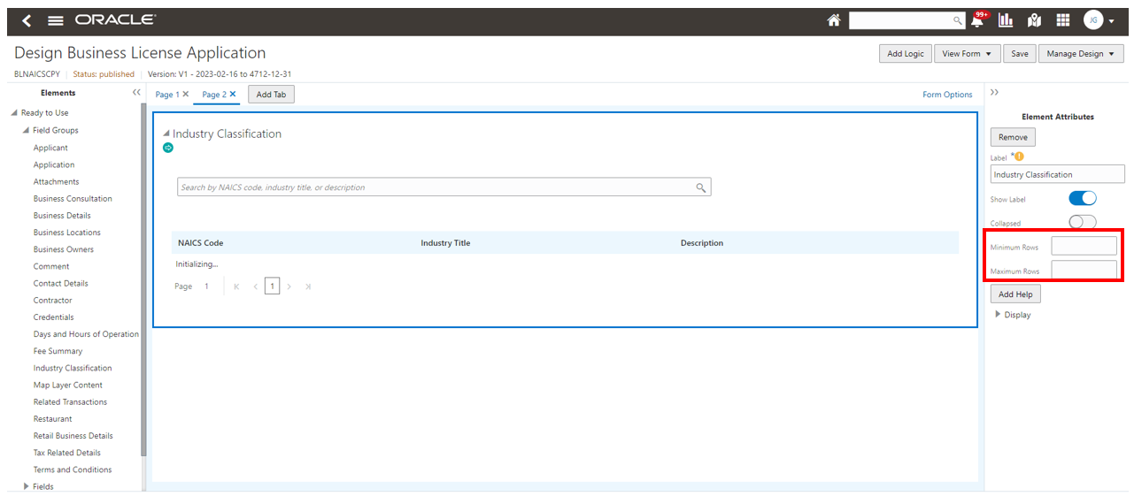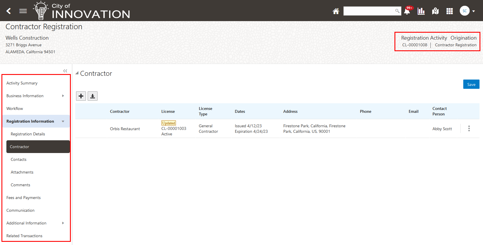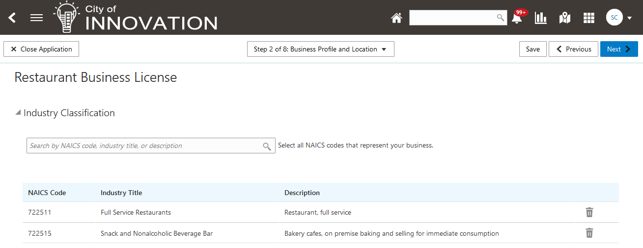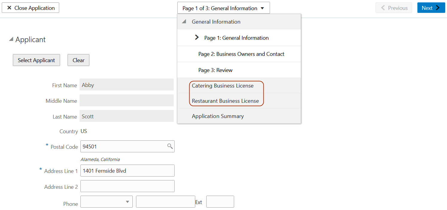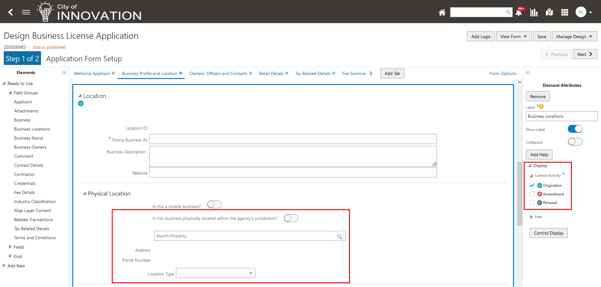 The same setup for permits and planning applications now also applies to business license applications, except the agency identifies the type of license activity (origination, amendment, and renewal) in the form design.