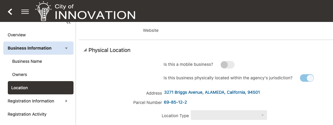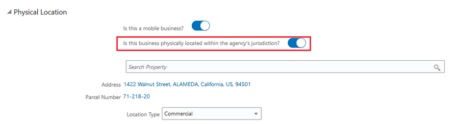 In the example below, the parcel link is enabled in the Location section of the Business License.